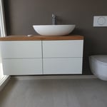 Haus B erhielt einen Estrich, einzelne farbige Wände und weisse Decken. Ausser im Bad und Keller wurde überall ein handgehobelter Parkett verlegt für ein einheitliche Bild. Einbauschränke und eine Einbaugarderobe ergänzten das Bild. Die Terrasse und der Balkon erhielten grosse 1x1m Steinfliesen in Anthrazit.